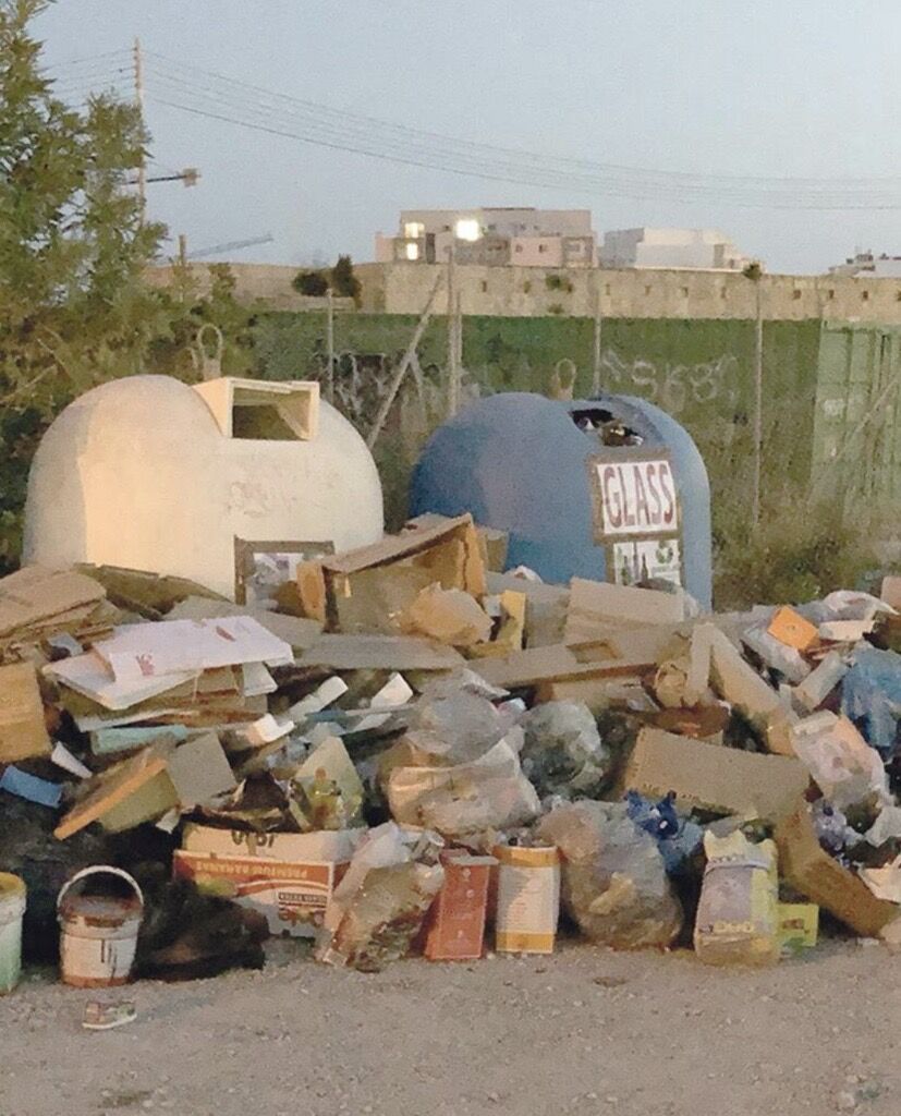A large pile of waste, including cardboard boxes, wooden planks, plastic buckets, and what appears to be construction debris, is dumped in front of a bring-in site. The overflowing mess contrasts sharply with the intended purpose of the recycling bins, suggesting illegal dumping or a lack of proper waste management. The scene reflects the challenges of waste disposal and the impact of human negligence on public spaces.