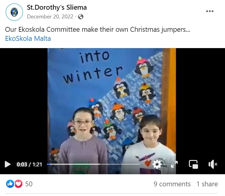 The video created by St Dorothy school Sliema, featuring student-members of the Eko-Skola committee, explains how the idea came about and the advantages of participating in such initiatives. The video also includes short clips filmed as the students were preparing their sweater using items they had at home and a few photos of the final product.