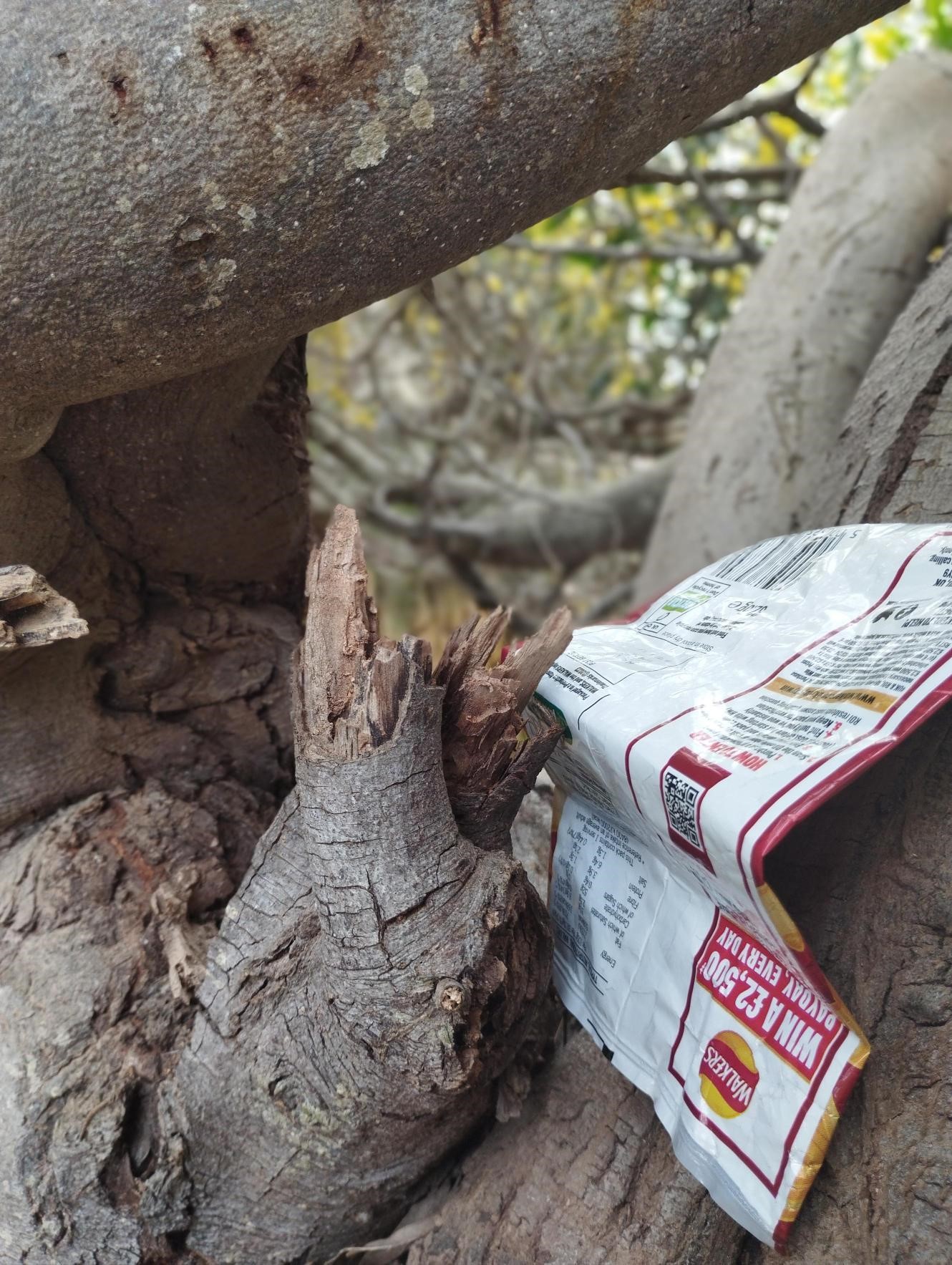 A bag of chips hangs from a tree, a peculiar blend of nature’s bounty and human indulgence.